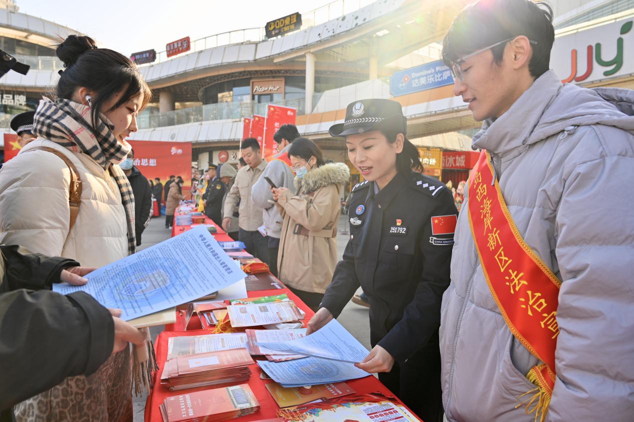 黄岛边检站民警与宣讲团成员共同参与宪法摊位宣传 张悦摄
