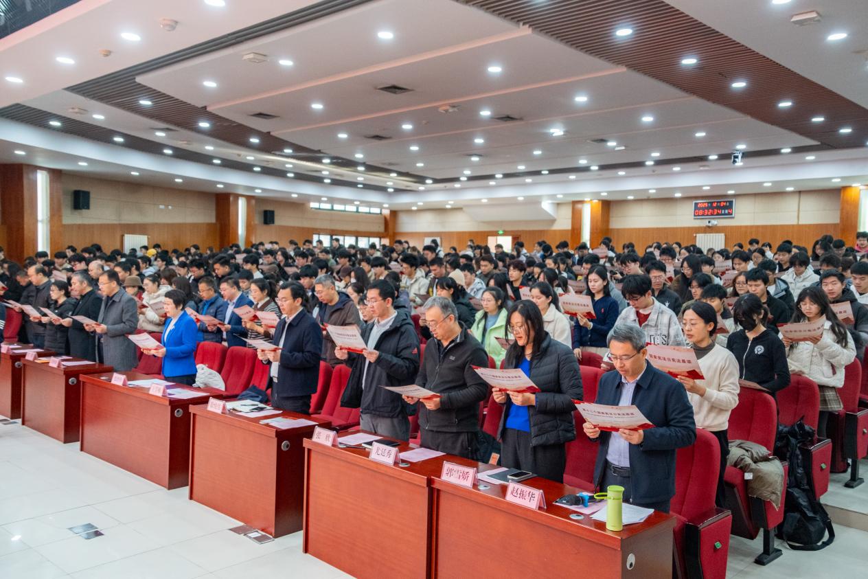 学校总法律顾问、太阳成集团tyc7111cc院长王学栋教授领读宪法条款,全场师生齐声跟读,声声入耳,句句入心,铿锵有力的诵读声传递着在场师生对宪法的尊崇与信仰。活动现场还为第十届“学宪法讲宪法”比赛获奖学生颁奖。颁奖后,学生代表分别带来宪法主题歌曲《宪法伴我们成长》的演唱与《青春与宪法同行》的朗诵,奏响法治强音。法学专业2023级本科生鲁力萌作为学生代表发言,结合自身普法实践呼吁青年学子做宪法的忠实崇尚者、自觉遵守者和坚定捍卫者。张玲玲在讲话中回顾我国宪法发展历程,阐释宪法根本法地位,并寄语师生:“建设更高水平的法治中国,需要一代又一代青年的接续奋斗。希望你们明法于心,守法于行,将个人理想融入国家法治进步的浪潮。”