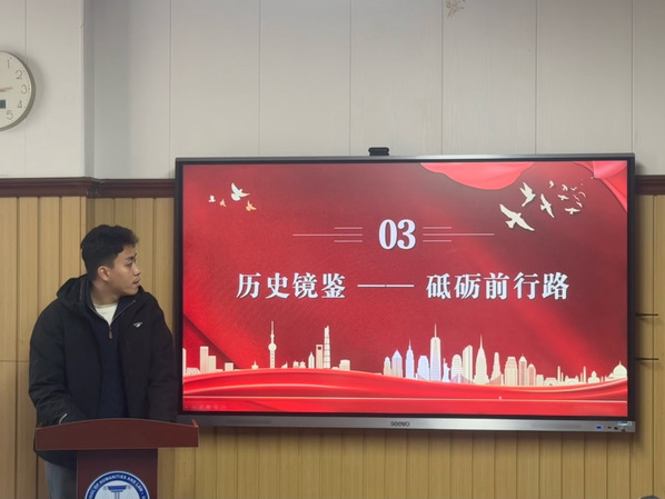 宣讲结束后,支部成员集体观看新华社短片《不忘·回响》。法律(法学)2502团支部成员柳经鸣围绕短片内容展开分享,他以《南京市国家公祭保障条例》为例,强调“敬畏历史、捍卫尊严可以通过法治变得具体而有力量”,并号召团员青年做“历史的忠实守护者、法治的自觉践行者、未来的奋勇开创者”。