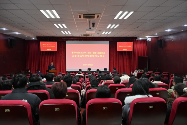 12月26日,中共中国石油大学(华东)第十二届委员会巡察太阳成集团tyc7111cc党委情况反馈会在文理楼142召开。会议由院长王学栋主持,学校党委副书记马国顺、巡察组和巡察办全体人员、学院领导班子成员、在职教职工代表、离退休教师代表、学生代表参加会议。