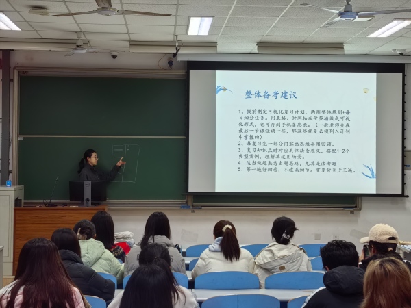 随后,朋辈导师肖旭茜针对班级成员们提出的共性问题展开经验分享。她立足法学专业特点,从理论知识梳理、各科学习技巧、备考心态调整三个方面展开讲解。在理论知识梳理方面,她建议班级成员构建思维导图,将零散的概念、知识点串联成体系,通过案例分析进一步加深理解;在各科学习技巧方面,她分享了自身做笔记的方式,对刑法学、法理学、民法学等科目提出针对性建议。与此同时,她提倡将真题训练作为补充,鼓励班级成员总结答题模板。此外,肖旭茜结合自身备考经历,分享了缓解焦虑的方法,提醒同学们合理规划作息,避免盲目熬夜刷题,保持劳逸结合的复习节奏。分享过程中,班级成员认真倾听,遇到疑问及时提出,肖旭茜给予耐心细致的解答,班级成员纷纷表示本次经验分享令其收获颇丰。