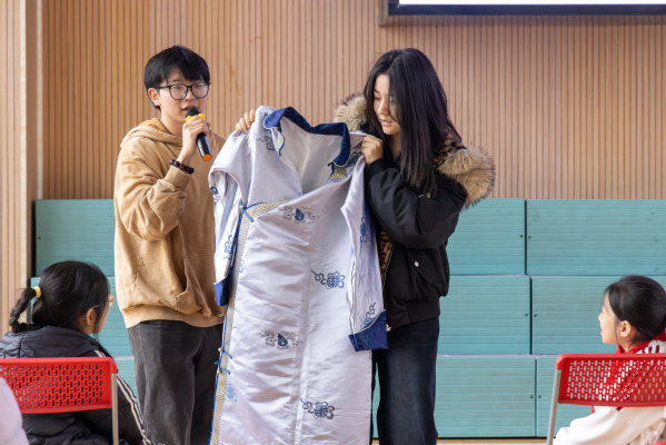 随后,蒙古族的郝一赫围绕蒙古族文化进行讲解。他从“马背上的民族”这一主题出发,介绍了蒙古包的结构智慧与色彩象征,并借助互动问答帮助同学们理解游牧生活的适应性。在讲述蒙古族“骑马、射箭、摔跤”三大传统运动时,他结合历史与民俗,说明了马在蒙古族生产、交通与精神信仰中的重要意义。饮食文化环节,他通过“红食”与“白食”的分类,介绍了蒙古族日常饮食与礼仪,并特别讲解了“全羊席”在隆重场合的文化内涵。